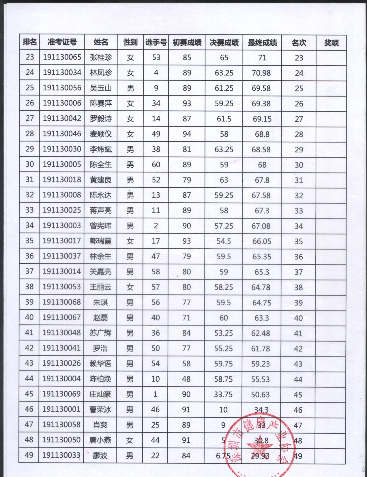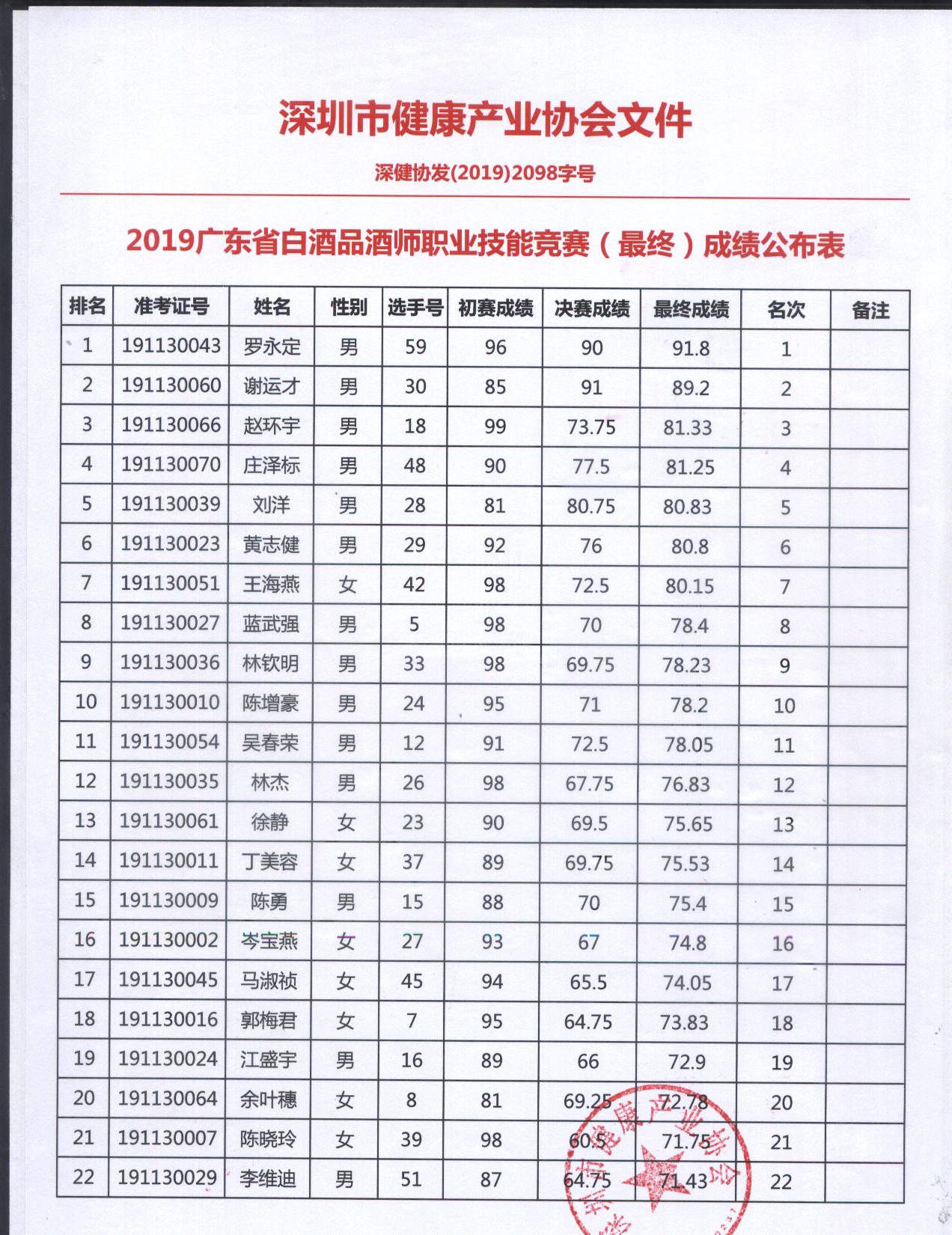 2019年廣東省白酒品酒師大賽決賽成績公布表