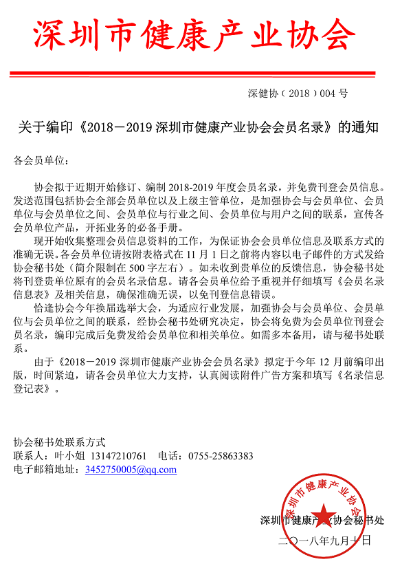 關于編印《2018-2019深圳市健康產業協會會員名錄》的通知