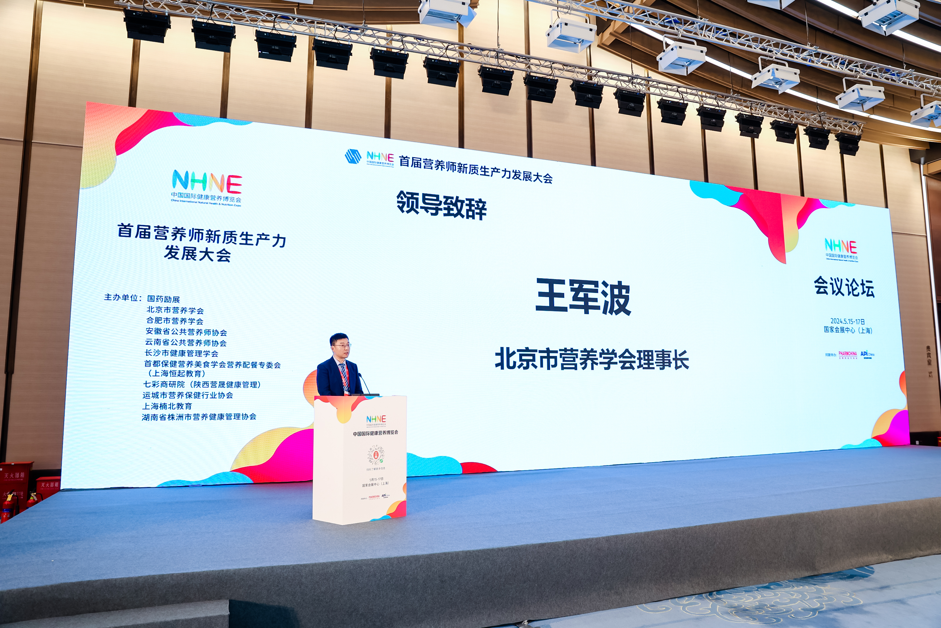 北京市營養學會理事長王軍波在會上發表了重要講話。他首先代表北京市營養學會對大會的舉辦表示熱烈祝賀,并對全國營養師在促進公眾健康、提高健康水平方面所做的貢獻給予了高度評價。王軍波理事長指出,營養師作為健康產業的重要力量,在提供個性化營養指導、促進營養健康知識普及等方面發揮著不可替代的作用。